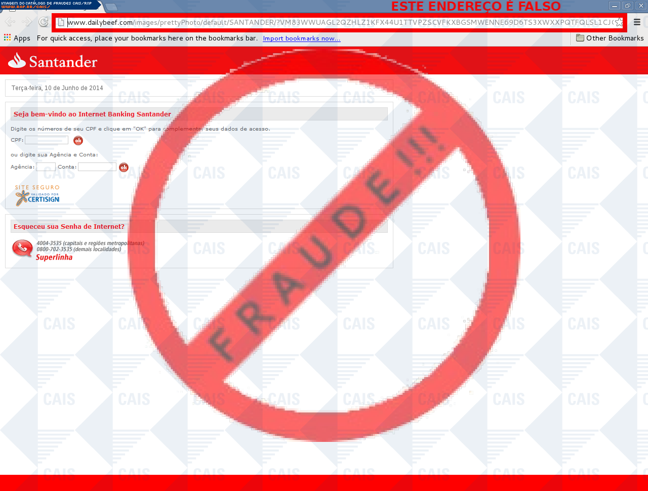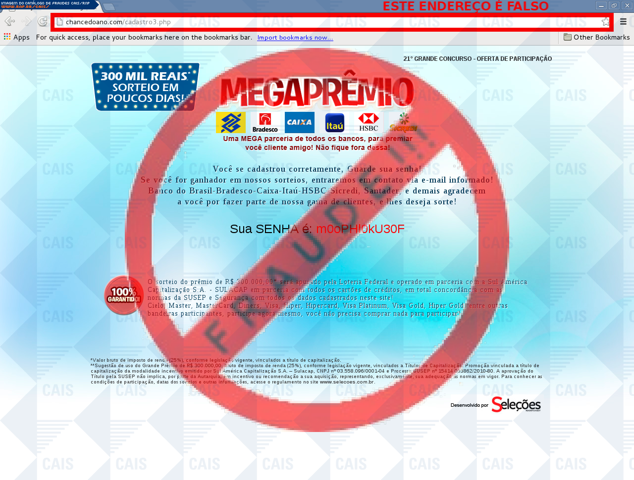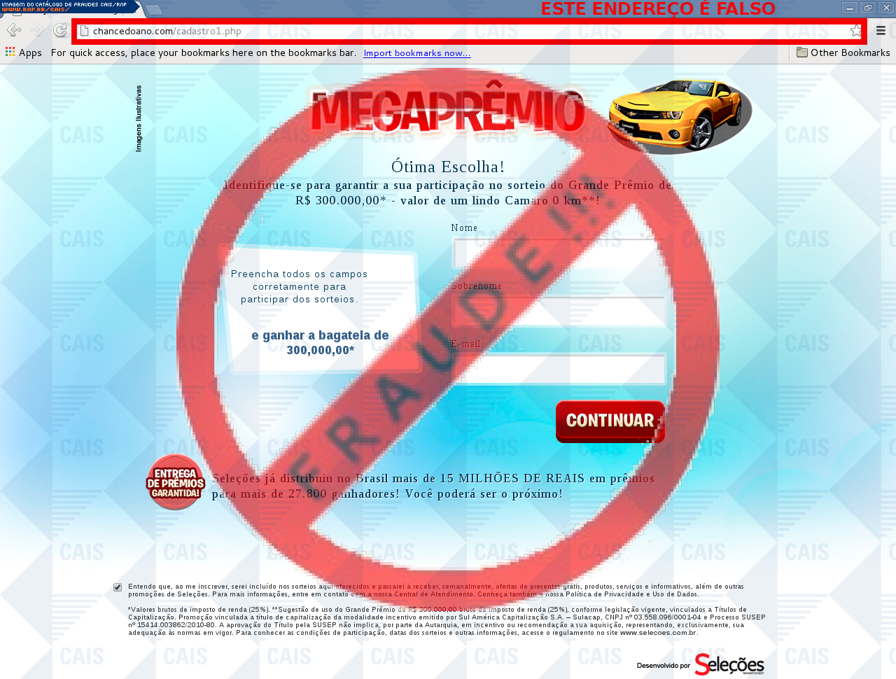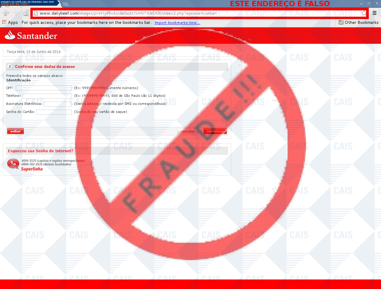 Esta página tem função informativa e educativa. Exibe uma coleção de imagens de phishing scam (fraudes eletrônicas) ou malware (código malicioso) veiculados por meio de spam (e-mail não-solicitado). Trata-se de conteúdo exemplificativo, não exaustivo, uma vez que não é possível contemplar todos os casos de fraudes existentes. Assim, caso você tenha conhecimento de um exemplar que não esteja aqui presente, isto não significa que não seja válido ou real. Inclusive incentivamos que você o envie para análise do CAIS para que, se for o caso, passe a integrar o nosso acervo.