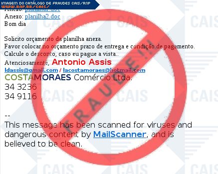 | comentário | A vítima recebe uma mensagem solicitando o orçamento da planilha disponível no e-mail enviado, no entanto ao realizar o download o arquivo se mostra malicioso com objetivo de roubar informações do usuário, com o nome de Gen:Variant.Symmi.23724. | |