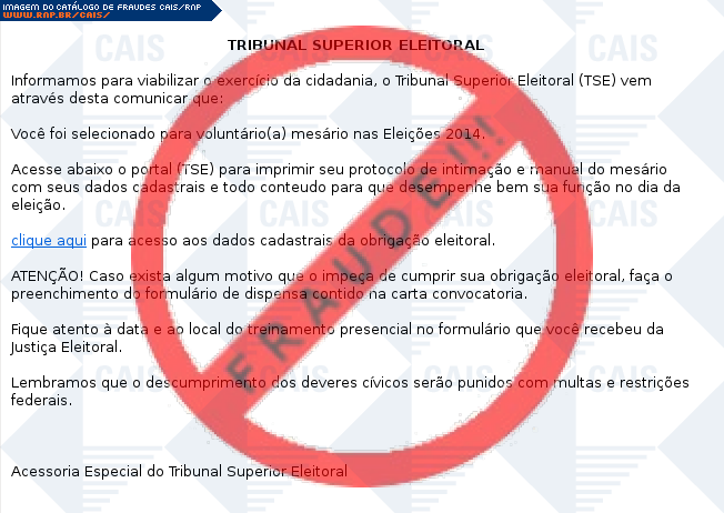 | comentário | O usuário recebe um e-mail informando que foi sorteado para participar como mesário voluntário nas eleições de 2014, sendo necessário o preenchimento de um cadastro, porém o arquivo é falso destinado a roubar informações da vítima, com o nome de Trojan.Win32.Banker.ab.... (leia mais) | |