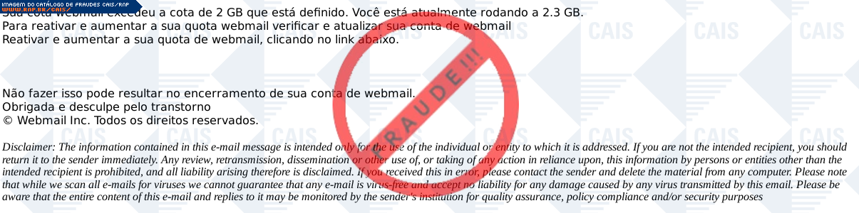 | comentário | O usuário recebe uma mensagem informando-o sobre a necessidade de reavaliar a sua conta de e-mail uma vez que a cota foi excedida, porém ao acessar o link é levado a um site falso contendo um formulário. Este formulário, além de nome de usuário também lhe... (leia mais) | |