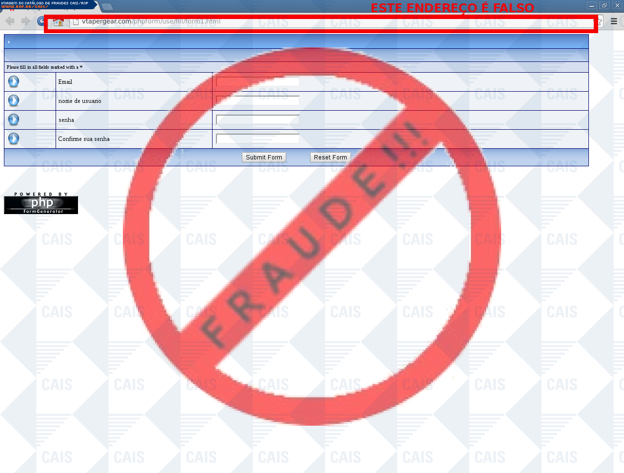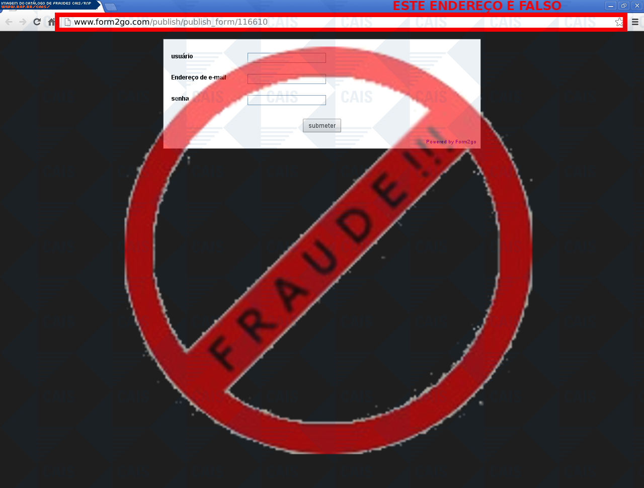 Esta página tem função informativa e educativa. Exibe uma coleção de imagens de phishing scam (fraudes eletrônicas) ou malware (código malicioso) veiculados por meio de spam (e-mail não-solicitado). Trata-se de conteúdo exemplificativo, não exaustivo, uma vez que não é possível contemplar todos os casos de fraudes existentes. Assim, caso você tenha conhecimento de um exemplar que não esteja aqui presente, isto não significa que não seja válido ou real. Inclusive incentivamos que você o envie para análise do CAIS para que, se for o caso, passe a integrar o nosso acervo.