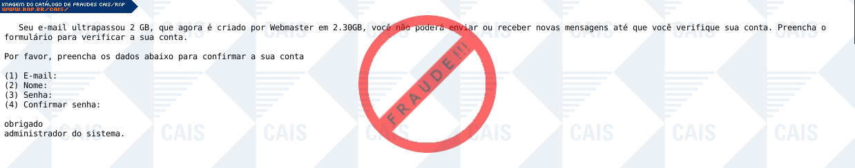 | comentário | O fraudador encaminha uma mensagem informando ao usuário que a sua conta de e-mail excedeu a cota de 2GB e que precisa atualizá-la através do site disponibilizado. Mas esse site é falso e contém um formulário solicitando dados sensíveis do usuário. | |