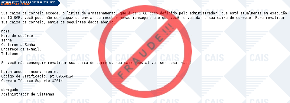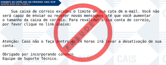 | comentário | O usuário recebe uma mensagem solicitando que atualize a sua cota de e-mail, porém o link disponibilizado leva-o a um site falso que solicita dados como nome, login e senha do usuário. Sendo que este site não pertence a instituição referida no e-mail. | |