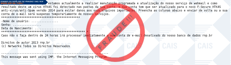 | comentário | A vítima recebe um email informando da necessidade da confirmação de seus dados em sua conta de webmail. Para tal, pedido que a mesma responda ao email informando suas credenciais de acesso. | |