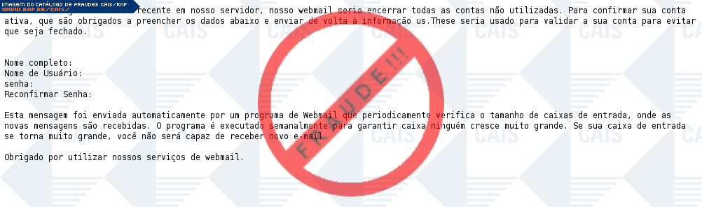 | comentário | A vítima recebe uma mensagem falsa informando da suposta necessidade recadastramento de sua conta de webmail. Para isso é requisitado que a vítima responda à mensagem informando dados pessoais e credenciais de acesso. | |