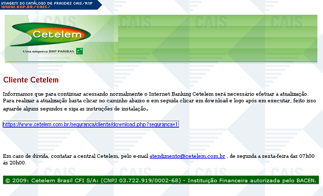 | comentário | Fraude que utiliza o nome do banco Cetelem informando sobre a necessidade de se fazer uma atualização para continuar acessando o Internet Banking Cetelem. O arquivo malicioso não foi encontrado durante a análise. | |