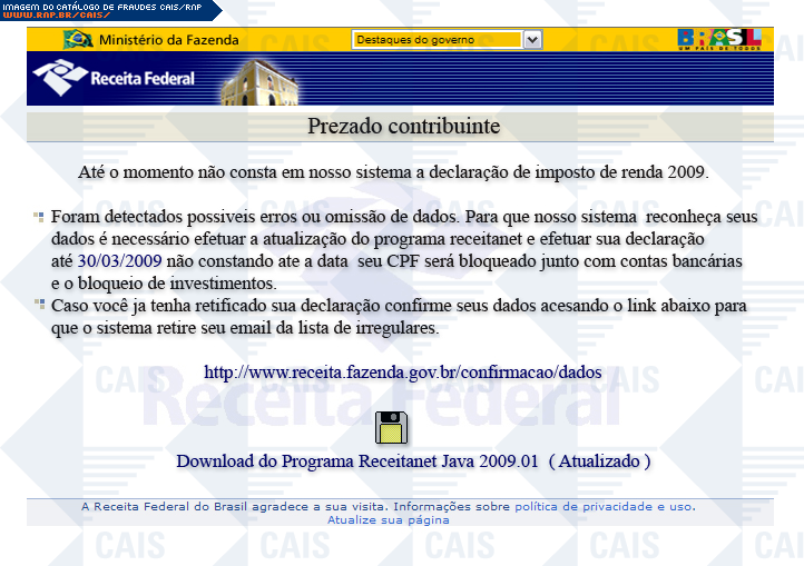 | comentário | Fraude que utiliza o nome da Receita Federal informando que não consta no sistema a declaração de imposto de renda 2009. A mensagem afirma que é necessário fazer a atualização do programa receitanet. O link na mensagem se refere a um arquivo malicioso detectado... (leia mais) | |