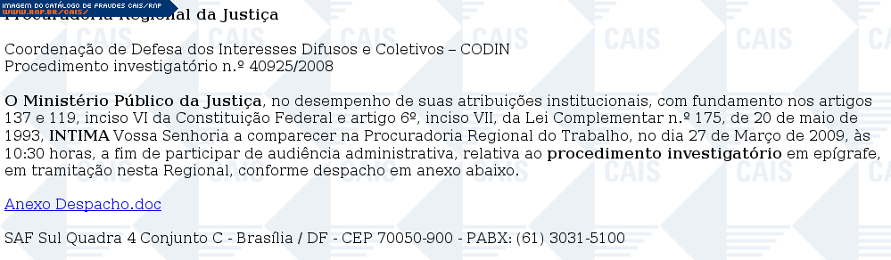 | comentário | Fraude que se passa por email da Polícia Federal intimando o recebedor a comparecer à Procuradoria Regional do Trabalho para suposta audiência. Um link na mensagem que deveria levar a mais informações sobre esta intimação leva a um software malicioso identificado... (leia mais) | |