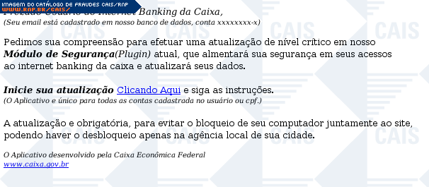 | comentário | Mensagem se passando por comunicado da Caixa Econômica Federal referente a atualização do módulo de segurança. A mensagem também diz que a atualização é obrigatória e, caso não seja feita, o computador não poderá acessar o Internet Banking da Caixa. Um link... (leia mais) | |