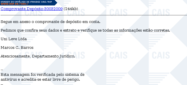 | comentário | Fraude que usa o nome de uma empresa chamada "Uni Leve Ltda", contendo um suposto comprovante de depósito em conta. A vítima é informada da necessidade de verificar se todos os dados estão corretos. Ao clicar no link, é feito o download do arquivo malicioso... (leia mais) | |