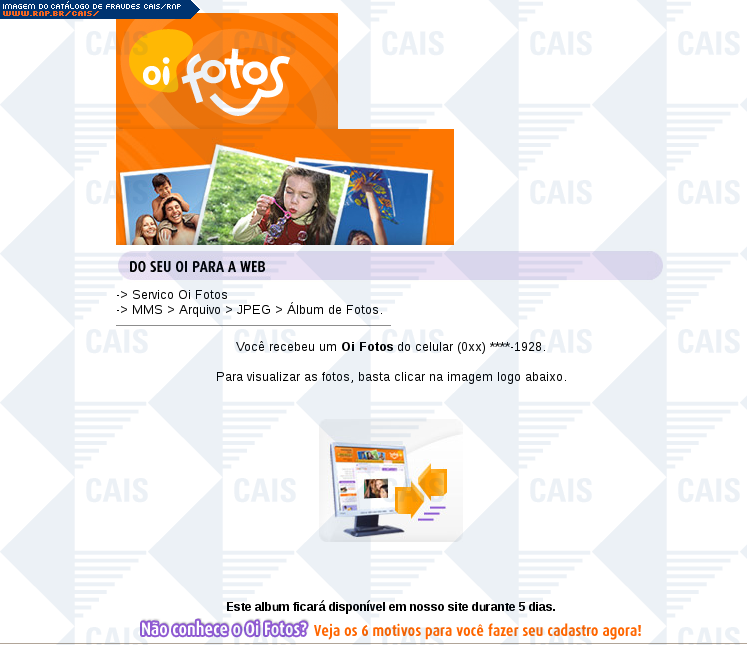 | comentário | Mensagem em nome da operadora de telefonia celular Oi, informando a vítima sobre o recebimento de um "Oi Fotos" por algum numero de celular não-identificado. O link redireciona para um arquivo malicioso que foi identificado como Trojan-Downloader.Win32.Banload.acna... (leia mais) | |