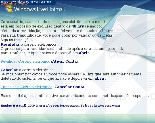 | comentário | Menagem se passando por comunicado do Hotmail comunicando a necessidade de revalidar a conta para que ela não seja excluída. Um fato curioso é que a mensagem oferece dois links: um para revalidação e outro para cancelamento, mas os dois levam ao mesmo software... (leia mais) | |