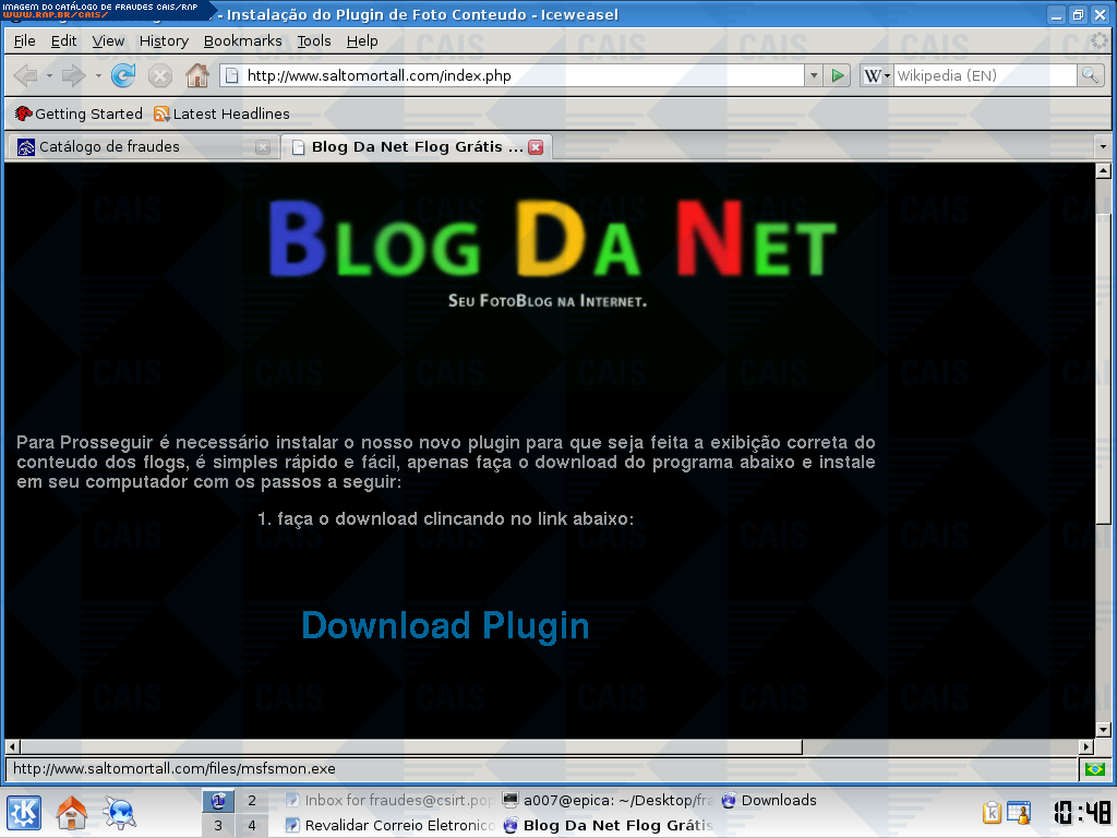 | comentário | Menagem que fala a respeito de cenas "quentes" no Big Brother Brasil e que contém um link suspeito onde tais cenas podem ser vistas. Tal link leva a um software malicioso identificado como Trojan-Downloader.Win32.Agent.boyr (Kaspersky). | |