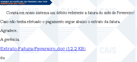 Esta página tem função informativa e educativa. Exibe uma coleção de imagens de phishing scam (fraudes eletrônicas) ou malware (código malicioso) veiculados por meio de spam (e-mail não-solicitado). Trata-se de conteúdo exemplificativo, não exaustivo, uma vez que não é possível contemplar todos os casos de fraudes existentes. Assim, caso você tenha conhecimento de um exemplar que não esteja aqui presente, isto não significa que não seja válido ou real. Inclusive incentivamos que você o envie para análise do CAIS para que, se for o caso, passe a integrar o nosso acervo.