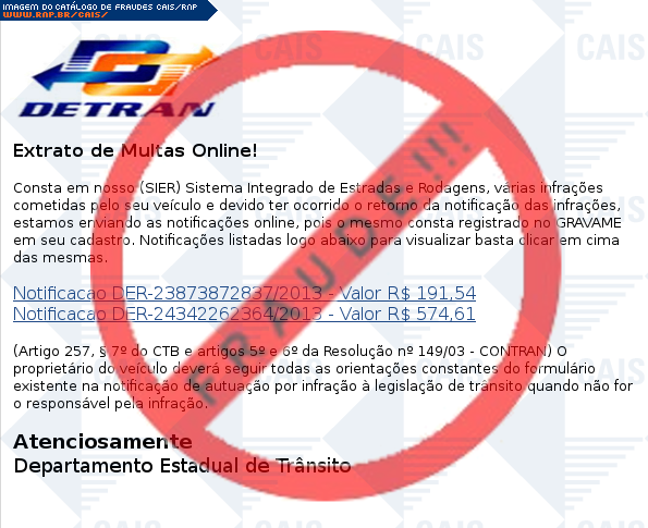 | comentário | Nessa fraude o usuário recebe um e-mail informando-o que existem multas de transito pendentes e que para visualizá-las basta acessar o link disponivel no e-mail, porém esses links levam a uma pagina de download de um malware. | |
