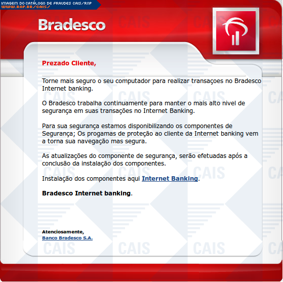 | comentário | Fraude utilizando o nome do Banco Bradesco alertando sobre a necessidade da instalação de componentes de segurança. A mensagem possui um link para a instalação dos supostos componentes. O link leva a conteúdo malicioso que já havia sido removido no momento... (leia mais) | |