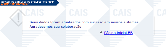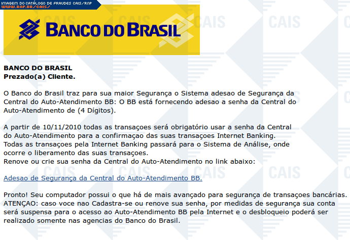 | comentário | Email do Banco do Brasil (falso) que informa que o BB está fornecendo certa adesão à senha da Central de Auto-Atendimento, de 4 dígitos (???). Informa que apartir de 10/11 as transações terão de usar esta senha e que ele deve acessar o link contido na mensagem.... (leia mais) | |