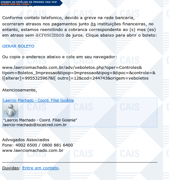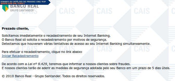 Esta página tem função informativa e educativa. Exibe uma coleção de imagens de phishing scam (fraudes eletrônicas) ou malware (código malicioso) veiculados por meio de spam (e-mail não-solicitado). Trata-se de conteúdo exemplificativo, não exaustivo, uma vez que não é possível contemplar todos os casos de fraudes existentes. Assim, caso você tenha conhecimento de um exemplar que não esteja aqui presente, isto não significa que não seja válido ou real. Inclusive incentivamos que você o envie para análise do CAIS para que, se for o caso, passe a integrar o nosso acervo.