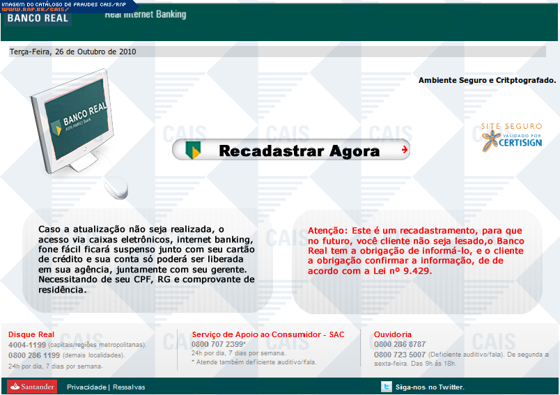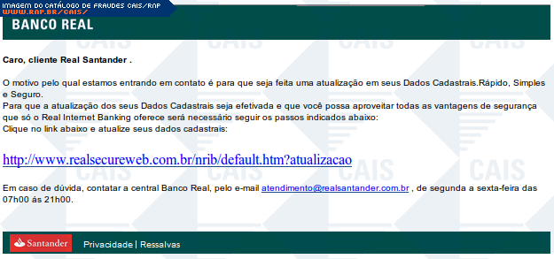 | assunto | Portal BANCO REAL - Atualização de seus DADOS CADASTRAIS | |