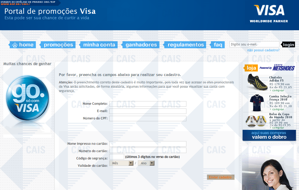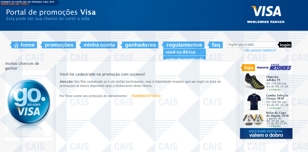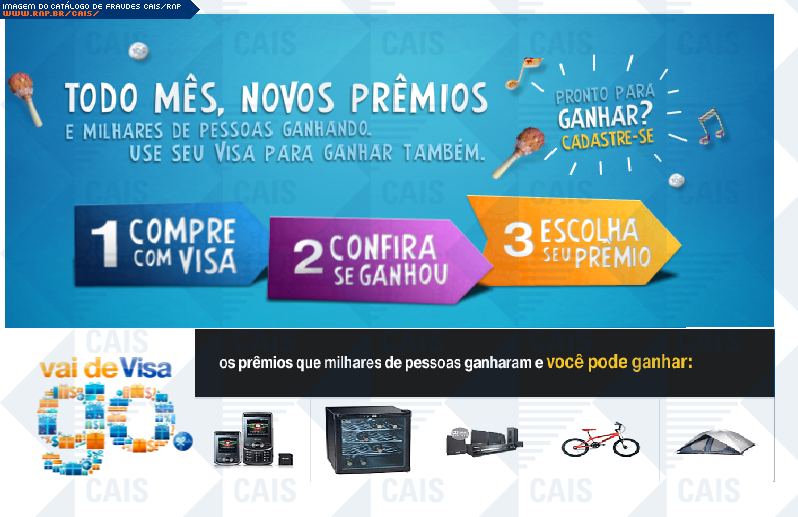 | comentário | Email sobre uma suposta promoção da Visa. A fraude utiliza de imagens verdadeiros da promoção Visa, mas direciona para um site falso. Note que o domínio (t35.com) não pertence à Visa. Note também, que o formulário pede que sejam inseridos o número do cartão,... (leia mais) | |