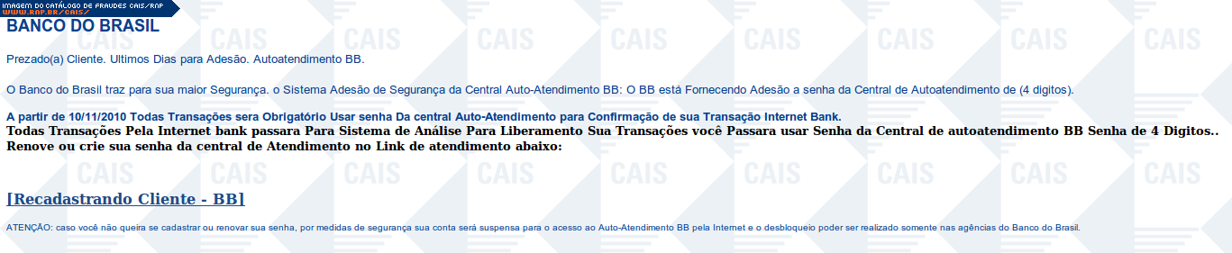 | comentário | Mensagem falsa do Banco do Brasil informando sobre o recadastramento da senha da Central de autoatendimento BB. O link para o recadastramento leva a uma página falsa que já havia sido removida no momento da análise. | |