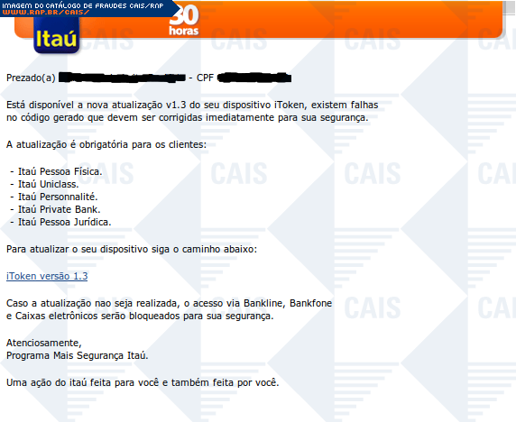 | comentário | Falso comunidado do banco Itaú alertando sobre uma atualização de segurança do Itoken. A mensagem alerta que caso a atualização nao seja realizada o acesso via Bankline, Bankfone e Caixas eletrônicos serão bloqueados. Diferente de outras fraudes essa contém... (leia mais) | |