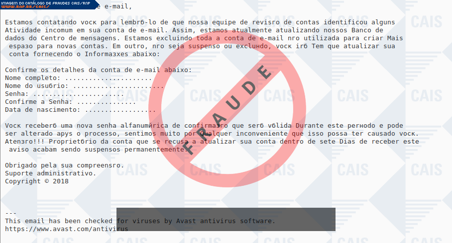 Esta página tem função informativa e educativa. Exibe uma coleção de imagens de phishing scam (fraudes eletrônicas) ou malware (código malicioso) veiculados por meio de spam (e-mail não-solicitado). Trata-se de conteúdo exemplificativo, não exaustivo, uma vez que não é possível contemplar todos os casos de fraudes existentes. Assim, caso você tenha conhecimento de um exemplar que não esteja aqui presente, isto não significa que não seja válido ou real. Inclusive incentivamos que você o envie para análise do CAIS para que, se for o caso, passe a integrar o nosso acervo.