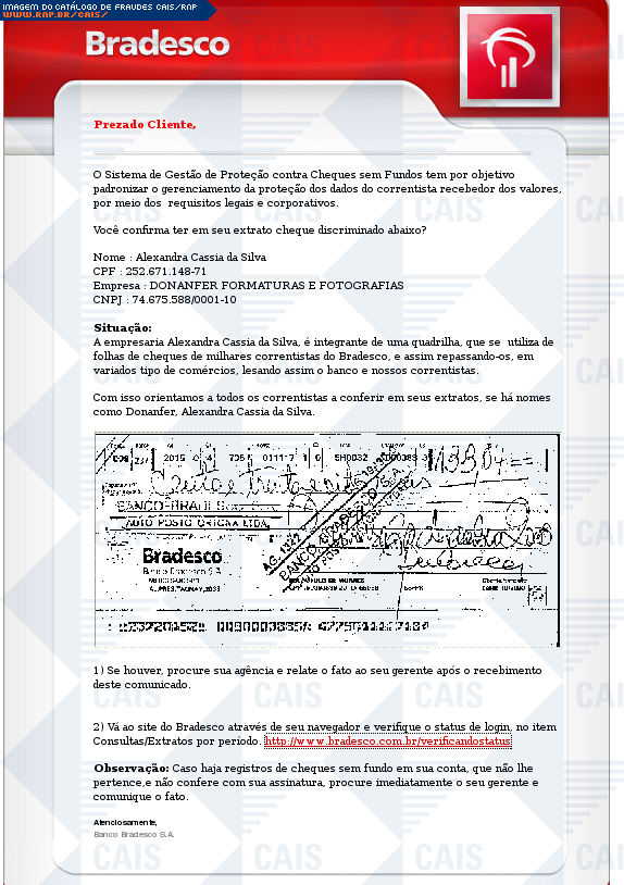 | comentário | Fraude que utiliza o nome do Banco Bradesco, pedindo aos seus clientes para conferirem em seus extratos se há nomes como Donanfer, Alexandra Cassia da Silva, que foi supostamente identificada como integrante de uma quadrilha. O link leva a vítima a um site... (leia mais) | |