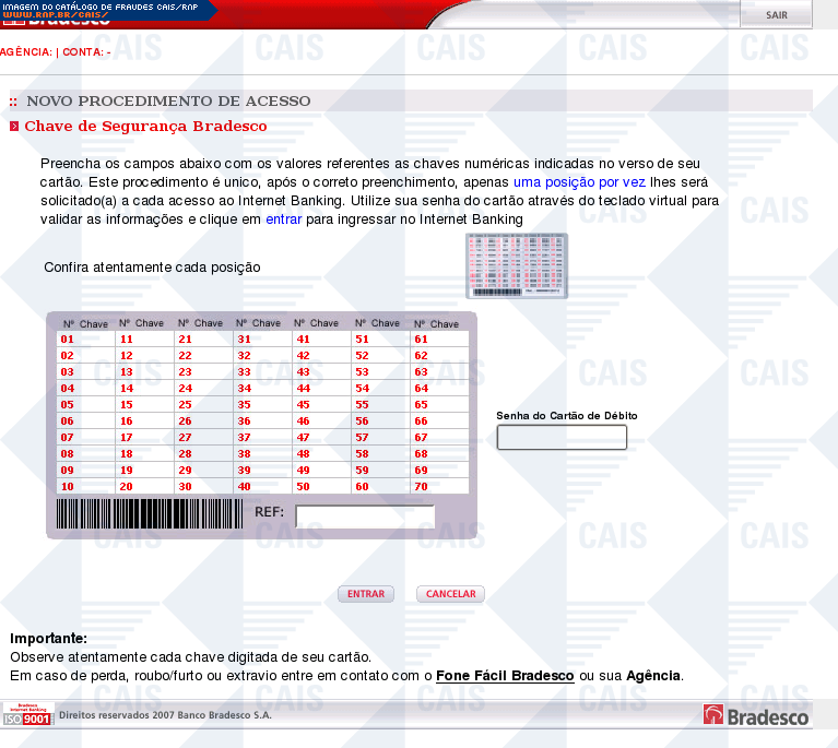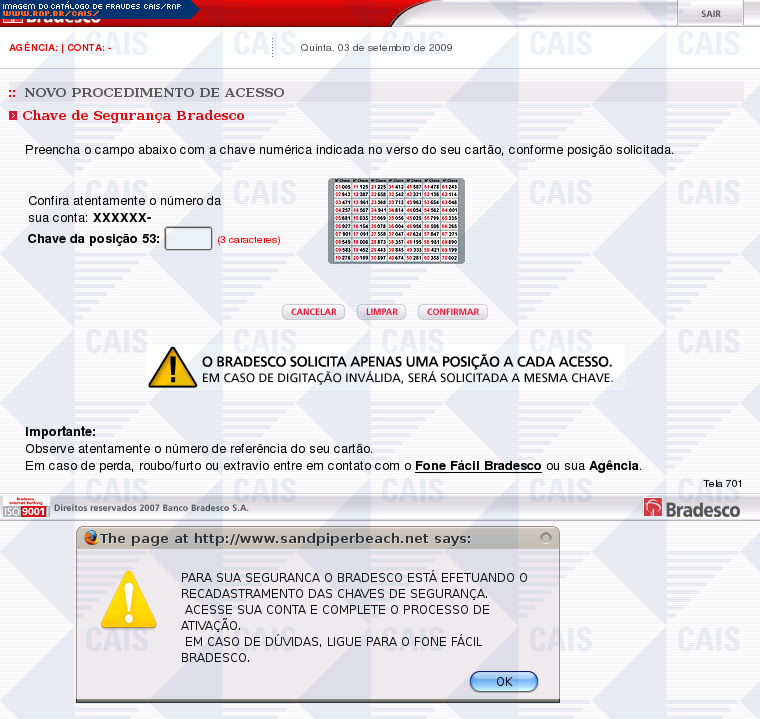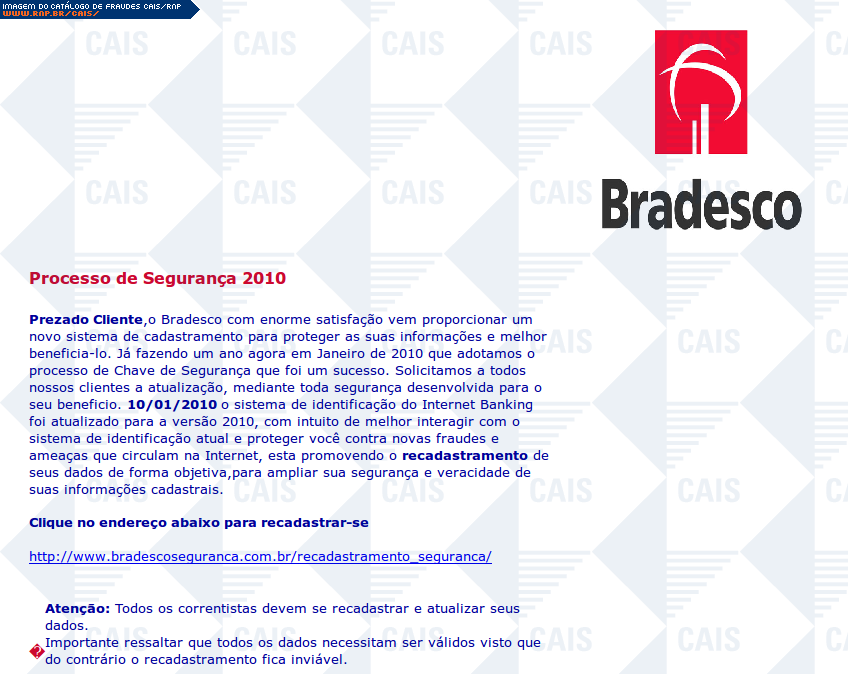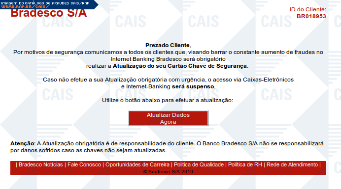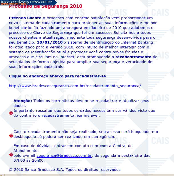 | comentário | Fraude se passando por comunicado do banco Bradesco dizendo que a vítima deve recadastrar seu Cartão Chave de Segurança para continuar acessando o Bradesco Internet Banking. O texto diz ainda que se o recadastramento não for efetuado a conta será bloqueada... (leia mais) | |