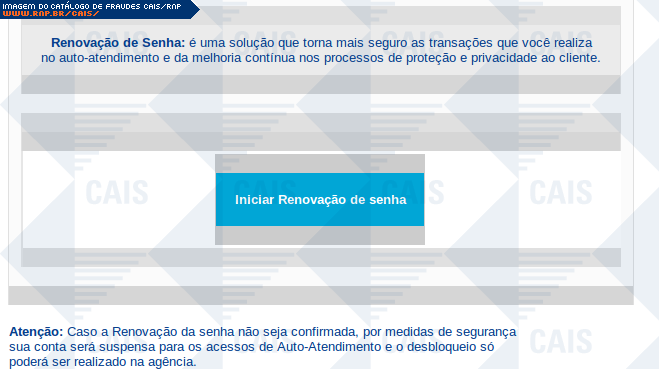 | comentário | A fraude avisa ao cliente que sua senha precisa ser renovada. No e-mail há um link para uma página idêntica à do Banco do Brasil, na qual são solicitados dados confidenciais. | |