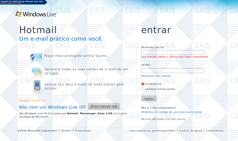 | comentário | Falso alerta de que a conta de e-mail da vítima foi bloqueada por conta de possível acesso não autorizado. O e-mail na verdade se trata de uma fraude que redireciona à uma falsa página do hotmail, com o intuito de roubar dados da conta do usuário. | |