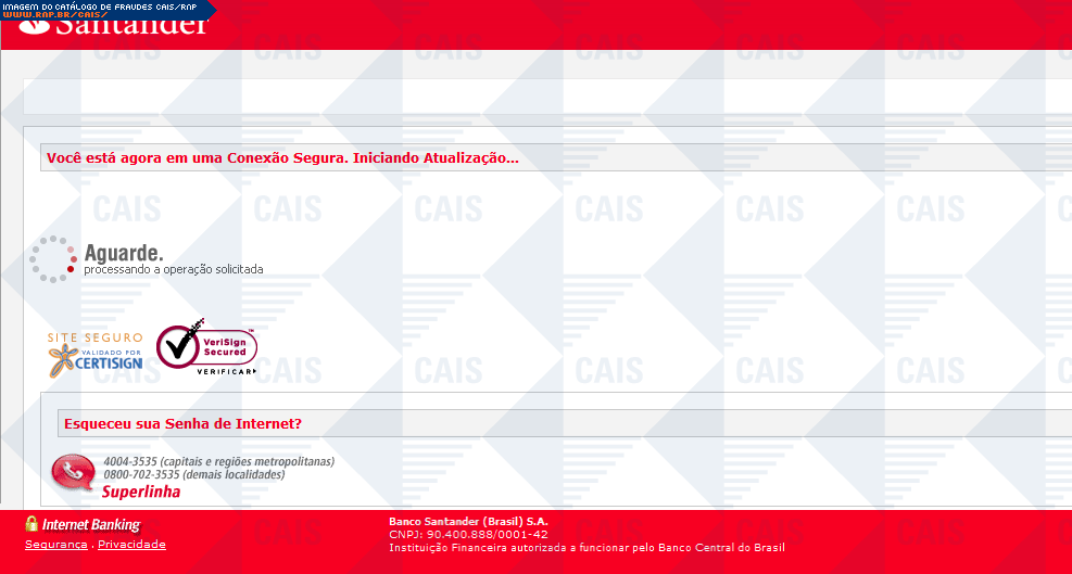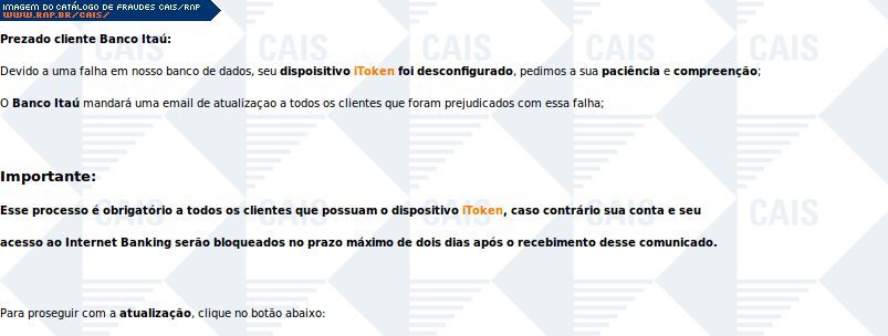 | comentário | A fraude avisa que o dispositivo iToken foi desconfigurado por motivo de uma falha no sistema e, portanto, uma atualização é necessária. O link para tal atualização encontrava-se indisponível no momento da análise. | |