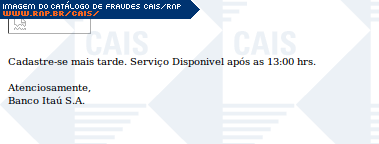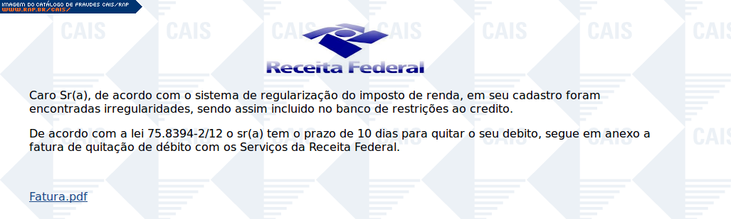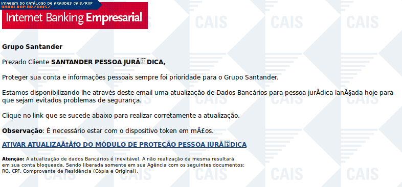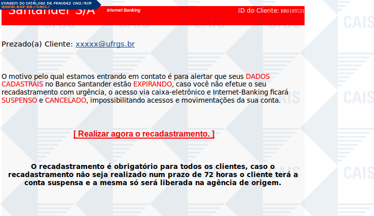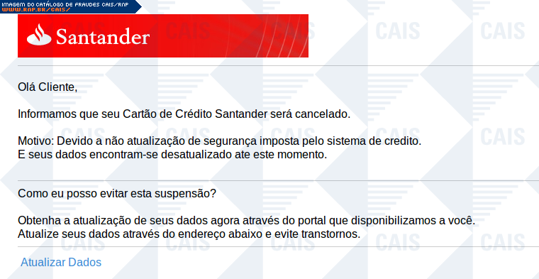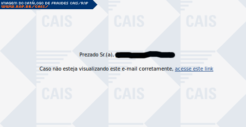 Esta página tem função informativa e educativa. Exibe uma coleção de imagens de phishing scam (fraudes eletrônicas) ou malware (código malicioso) veiculados por meio de spam (e-mail não-solicitado). Trata-se de conteúdo exemplificativo, não exaustivo, uma vez que não é possível contemplar todos os casos de fraudes existentes. Assim, caso você tenha conhecimento de um exemplar que não esteja aqui presente, isto não significa que não seja válido ou real. Inclusive incentivamos que você o envie para análise do CAIS para que, se for o caso, passe a integrar o nosso acervo.