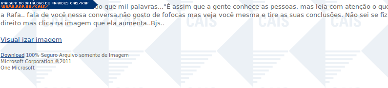 | comentário | Instiga a vítima a clicar no link que contém uma suposta imagem, provavelmente tal link levaria ao download de um malware. Contudo esta não estava disponível no momento da análise. | |