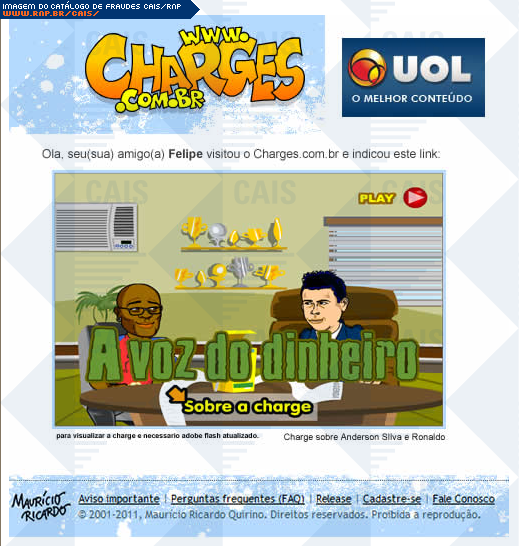 | comentário | A mensagem contém um link para uma charge sobre o lutador Anderson Silva. O link leva a conteúdo malicioso que não estava mais disponível no momento da análise. | |