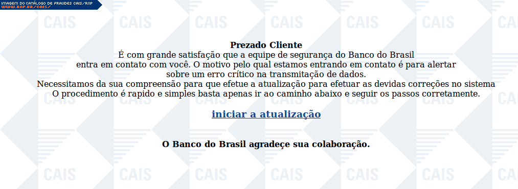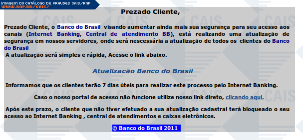 | comentário | Informa à vítima que devido á um problema interno os dados do cliente precisam ser atualizados. trata-se de um pishing com link para uma página idêntica à do banco do brasil. Na página direcionada são pedidos dados confidenciais tais como senha do cartão... (leia mais) | |