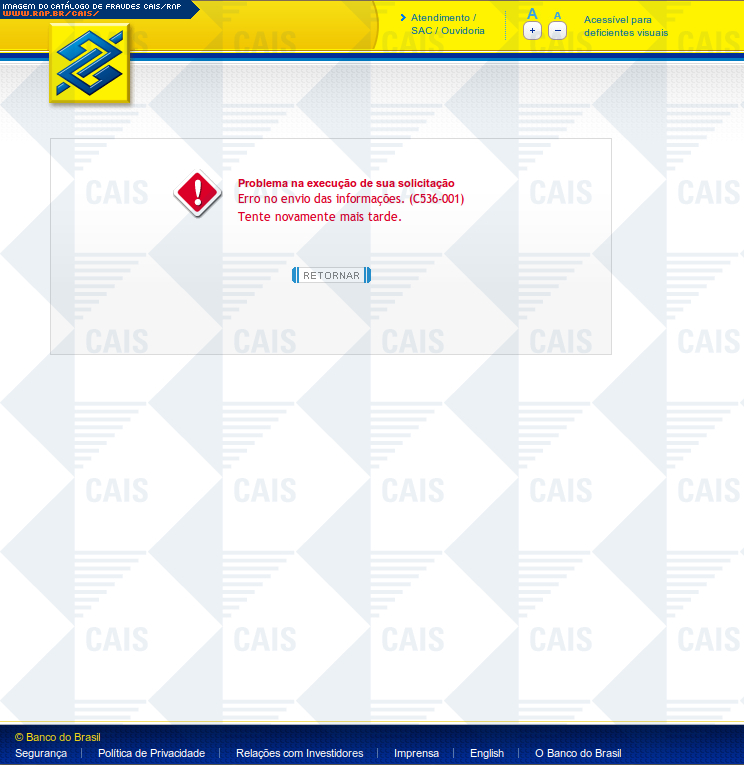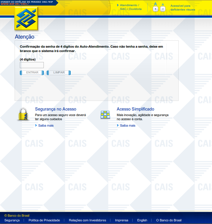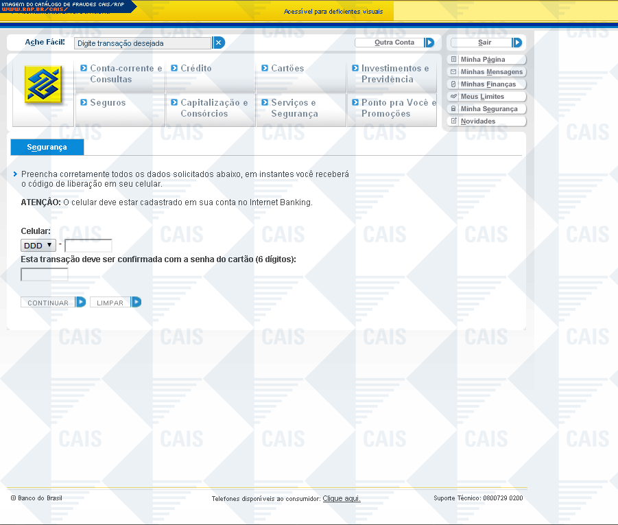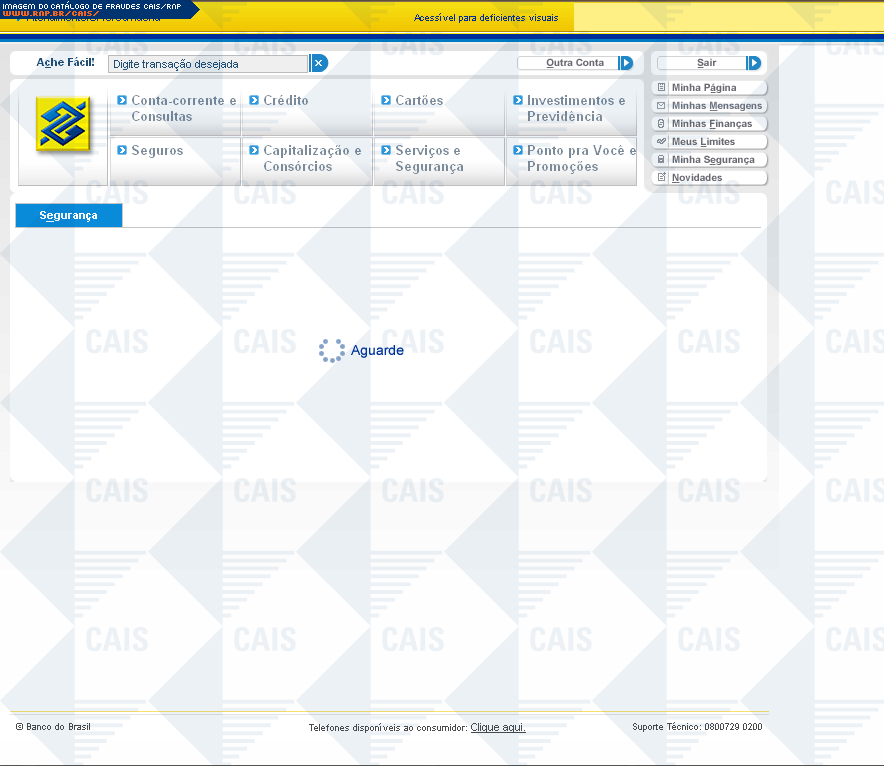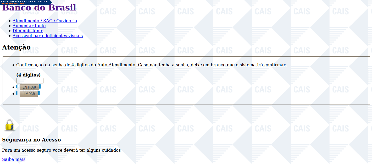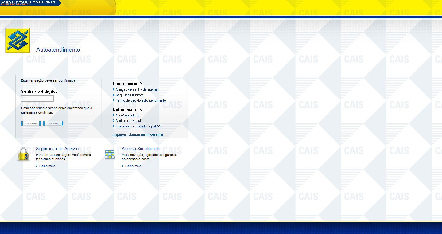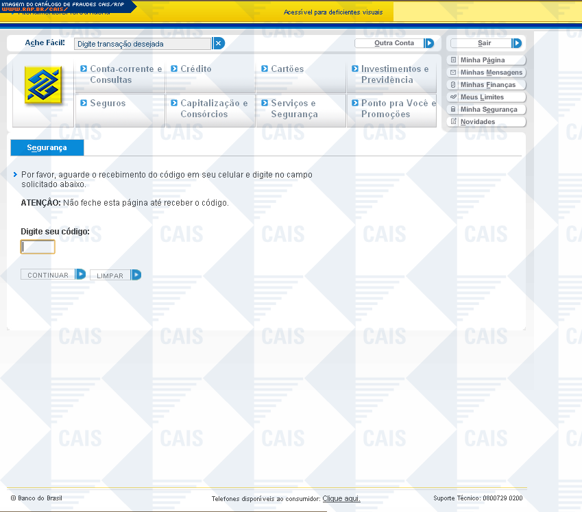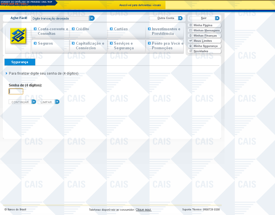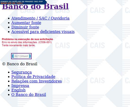 | tipo | Banco do Brasil - problemas internos senha | ID: 13171 |