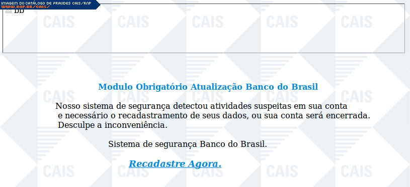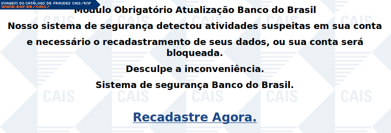 | comentário | A fraude usa o nome do Banco do Brasil para tentar aliciar a vítima a realizar um recadastramento falso. O link para o recadastramento leva a uma página falsa, destinada a roubar dados da conta bancária da vítima. | |