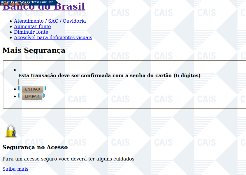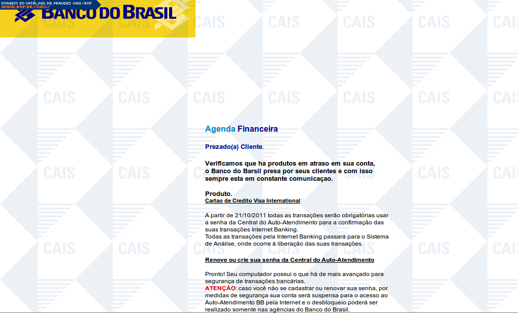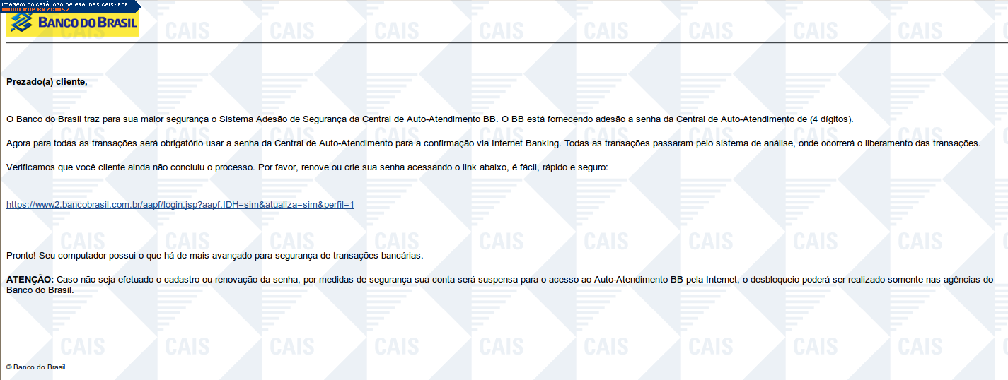 | comentário | A mensagem, em nome do Banco do Brasil, informa que a vítima deve realizar a nova correção para a renovação da senha da central de segurança. O link para a suposta atualização leva a uma página falsa, destinada a roubar dados da conta bancária da vítima. | |