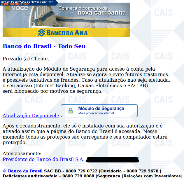 | comentário | A mensagem contém um link para a suposta atualização do módulo de segurança do Banco do Brasil. O conteúdo malicioso já havia sido removido no momento da análise. | |