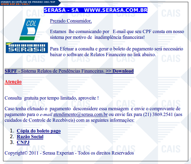 | comentário | A fraude usa o nome da SERASA para comunicar sobre uma suposta inadimplência da vítima. A mensagem contém um link que leva a um software malicioso que foi identificado como Gen:Variant.Zusy.21 (BitDefender). | |