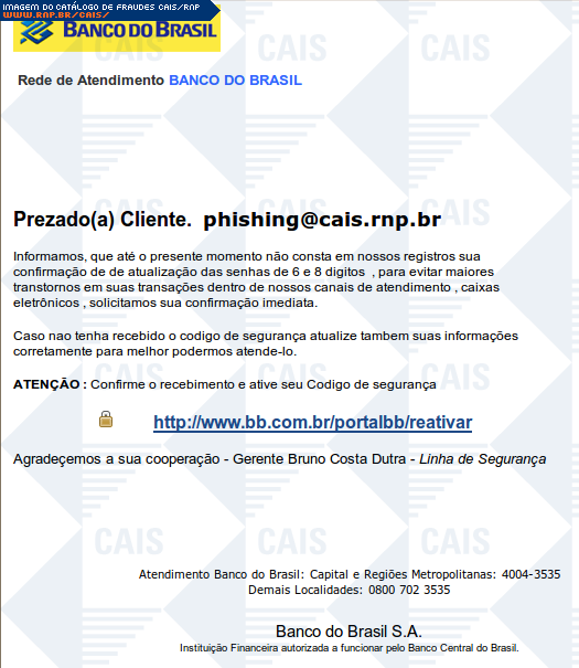 Esta página tem função informativa e educativa. Exibe uma coleção de imagens de phishing scam (fraudes eletrônicas) ou malware (código malicioso) veiculados por meio de spam (e-mail não-solicitado). Trata-se de conteúdo exemplificativo, não exaustivo, uma vez que não é possível contemplar todos os casos de fraudes existentes. Assim, caso você tenha conhecimento de um exemplar que não esteja aqui presente, isto não significa que não seja válido ou real. Inclusive incentivamos que você o envie para análise do CAIS para que, se for o caso, passe a integrar o nosso acervo.