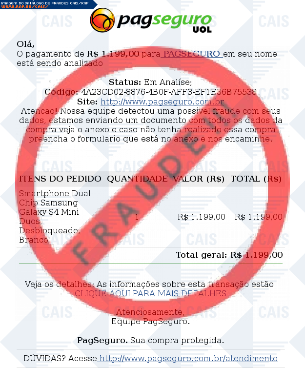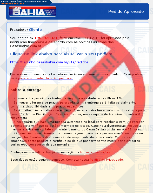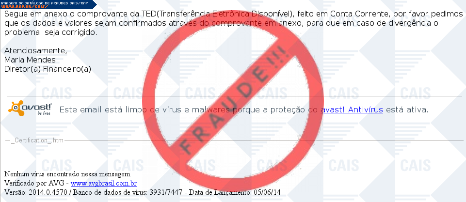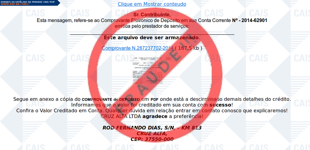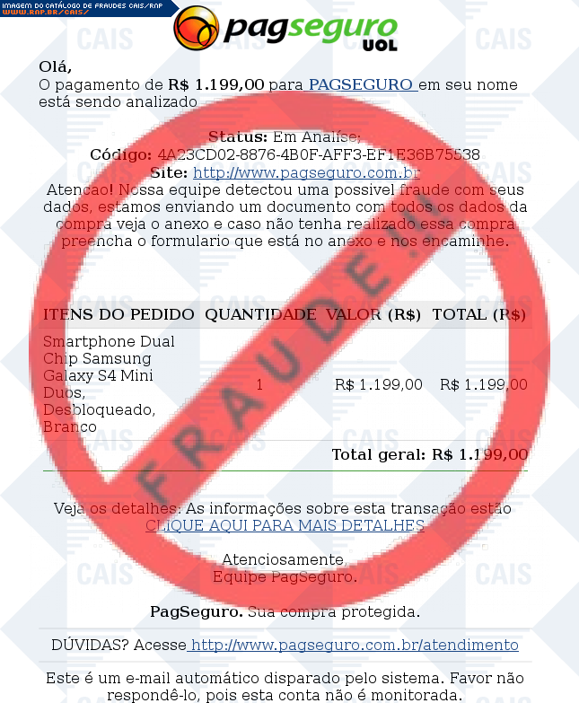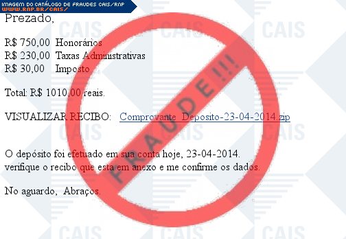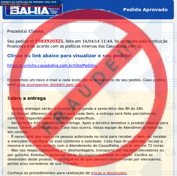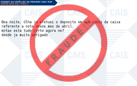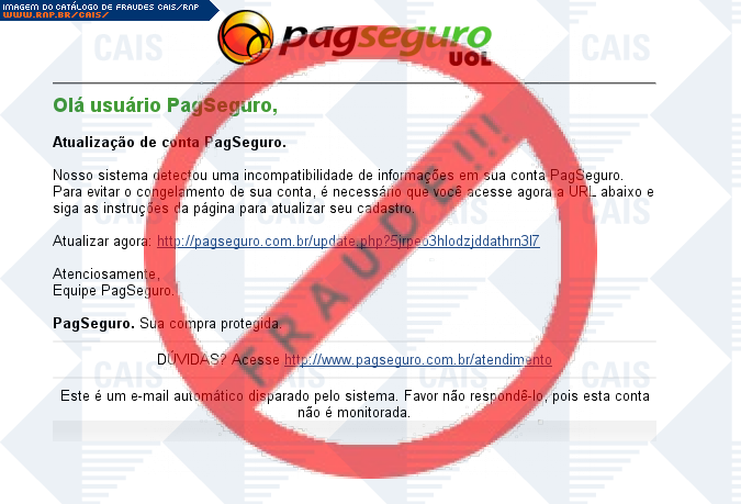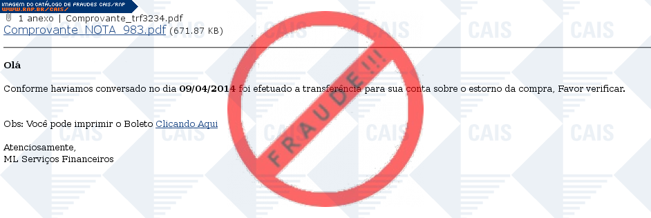 Esta página tem função informativa e educativa. Exibe uma coleção de imagens de phishing scam (fraudes eletrônicas) ou malware (código malicioso) veiculados por meio de spam (e-mail não-solicitado). Trata-se de conteúdo exemplificativo, não exaustivo, uma vez que não é possível contemplar todos os casos de fraudes existentes. Assim, caso você tenha conhecimento de um exemplar que não esteja aqui presente, isto não significa que não seja válido ou real. Inclusive incentivamos que você o envie para análise do CAIS para que, se for o caso, passe a integrar o nosso acervo.