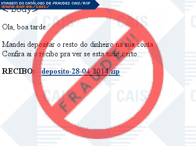 | comentário | A vítima recebe uma mensagem, contendo um comprovante de depósito em conta. Mas na verdade trata-se de um software malicioso, que é usado para infectar sua máquina e roubar informações. | |