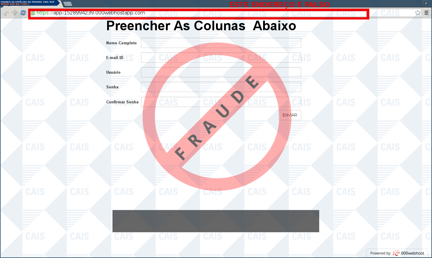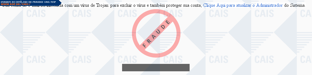 Esta página tem função informativa e educativa. Exibe uma coleção de imagens de phishing scam (fraudes eletrônicas) ou malware (código malicioso) veiculados por meio de spam (e-mail não-solicitado). Trata-se de conteúdo exemplificativo, não exaustivo, uma vez que não é possível contemplar todos os casos de fraudes existentes. Assim, caso você tenha conhecimento de um exemplar que não esteja aqui presente, isto não significa que não seja válido ou real. Inclusive incentivamos que você o envie para análise do CAIS para que, se for o caso, passe a integrar o nosso acervo.