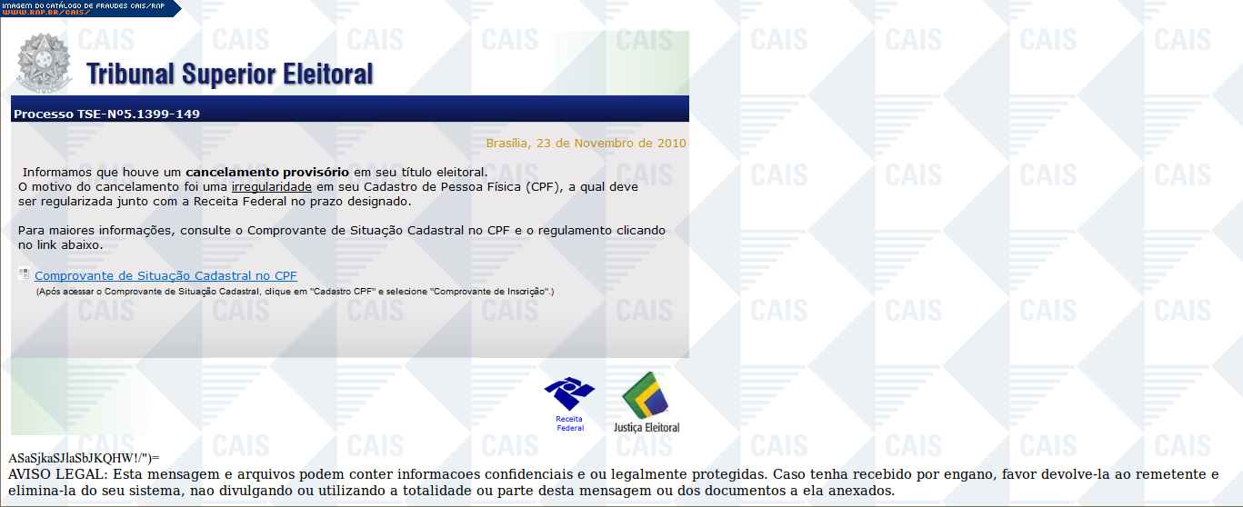 Esta página tem função informativa e educativa. Exibe uma coleção de imagens de phishing scam (fraudes eletrônicas) ou malware (código malicioso) veiculados por meio de spam (e-mail não-solicitado). Trata-se de conteúdo exemplificativo, não exaustivo, uma vez que não é possível contemplar todos os casos de fraudes existentes. Assim, caso você tenha conhecimento de um exemplar que não esteja aqui presente, isto não significa que não seja válido ou real. Inclusive incentivamos que você o envie para análise do CAIS para que, se for o caso, passe a integrar o nosso acervo.