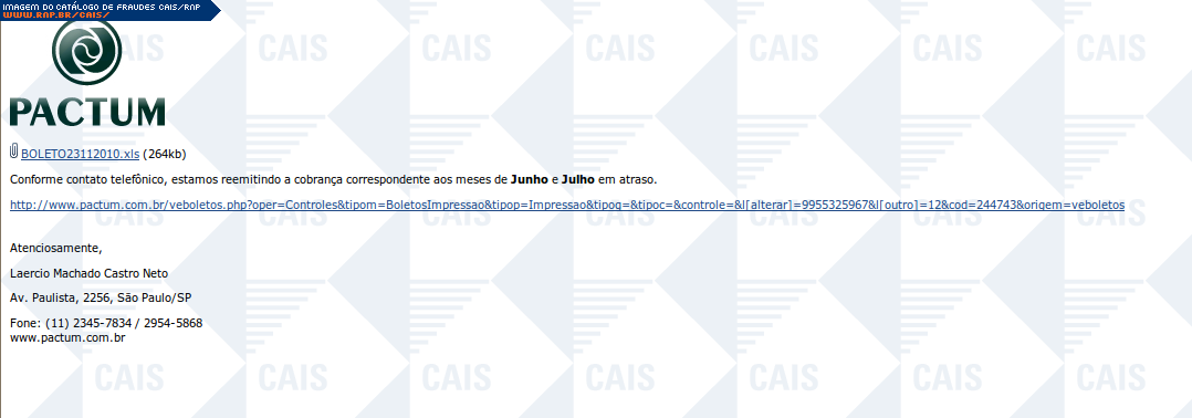 | comentário | Mensagem se passando pala Pactum cobrando pagamento de boleto atrasado. A mensagem fornece um link que seria para o suposto boleto. O link leva a uma página falsa que solicita a instalação do Adobe Flash Player e que leva a um software malicioso que foi identificado... (leia mais) | |