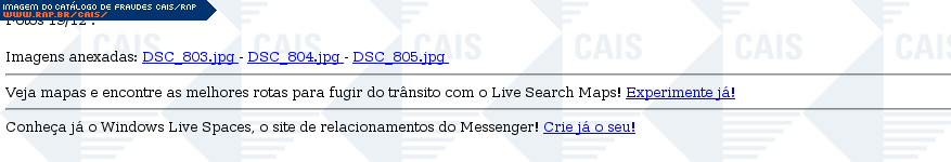 | comentário | Mensagem contendo simplesmente links de supostas fotos, mas que levam a um software malicioso. Este foi identificado como Trojan-Downloader.Win32.Banload.aasb (F-Secure). | |