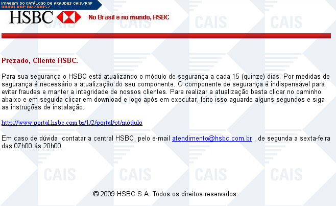 Esta página tem função informativa e educativa. Exibe uma coleção de imagens de phishing scam (fraudes eletrônicas) ou malware (código malicioso) veiculados por meio de spam (e-mail não-solicitado). Trata-se de conteúdo exemplificativo, não exaustivo, uma vez que não é possível contemplar todos os casos de fraudes existentes. Assim, caso você tenha conhecimento de um exemplar que não esteja aqui presente, isto não significa que não seja válido ou real. Inclusive incentivamos que você o envie para análise do CAIS para que, se for o caso, passe a integrar o nosso acervo.