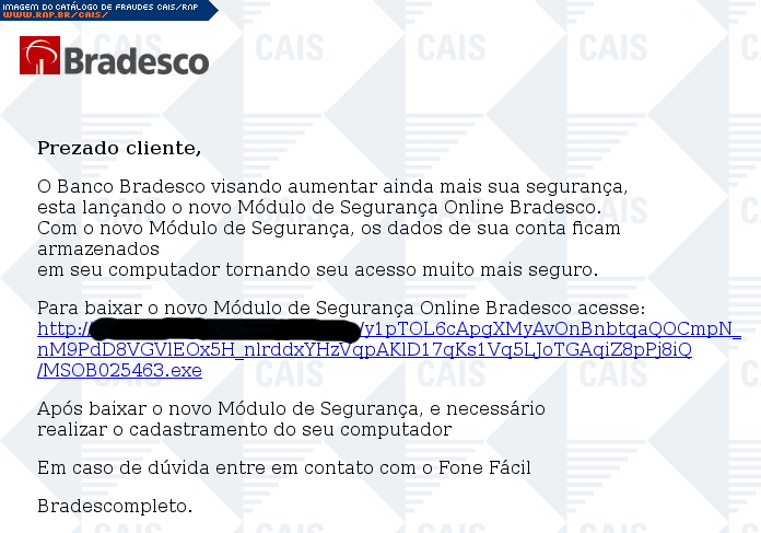 | comentário | Mensagem de fraude que usa o nome do banco Bradesco. O e-mail informa sobre um novo módulo de segurança online, que deve ser instalado para tornar o acesso mais "seguro". O link direciona para o software malicioso PWS-Banker.gen.b (McAfee). | |